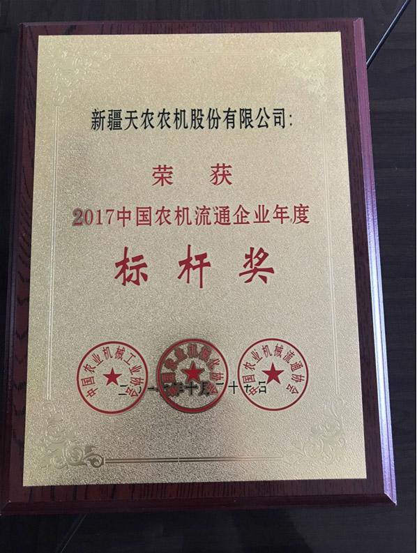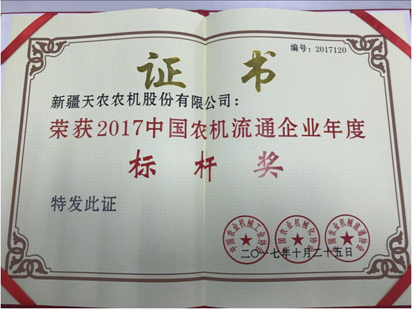 2017中國農(nóng)機(jī)行業(yè)年度大獎評選活動,經(jīng)過申報(bào)、初審、大眾網(wǎng)上投票、千人專家(專業(yè)人士)團(tuán)網(wǎng)上投票和百名專家現(xiàn)場分組評審,在本次評選中新疆天農(nóng)農(nóng)機(jī)股份有限公司以優(yōu)異的成績,榮獲2017中國農(nóng)機(jī)流通企業(yè)年度標(biāo)桿獎。
